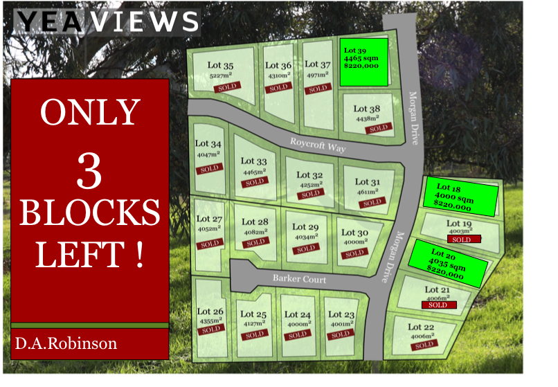 With titles issued and now ready to build on, you will need to move quickly to secure the last premium block in the prestigious Yea Views Estate. All blocks with Electricity, Mains water, Sewerage and NBN connection! Land size is at least 4000 m2. This final lot 18 is $220,000 with 10% deposit. Contact the agent to arrange a walk on the land to discuss further. .